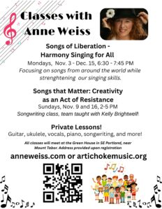 | 11/08/25 | Anne Weiss and Dave Keller | Portland, OR | house concert |
