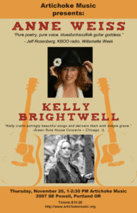On Thursday, November 20, I will have the great pleasure of playing an afternoon show with the fabulous Kelly Brightwell at Artichoke Music! Check the Gigs page for two shows in the Last Waltz series at the Alberta Rose Theatre as well.